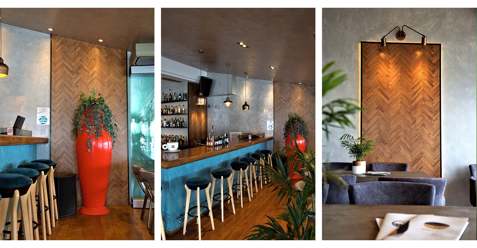 Del Mar Coffee Bar in Corinth beachfront blends natural elements into its design, creating a relaxing, coastal atmosphere. The central concept revolves around three main colors: the wave-like wood structure, the sandy beige tones, and the deep blue of the sea. These elements bring the outdoors inside, merging the interior space with the surrounding beach environment. The materials and textures create a warm, inviting atmosphere that complements the coastal location. Every detail, from the furniture to the lighting, enhances the connection to the sea, inviting guests to enjoy a calm yet lively experience at the café.