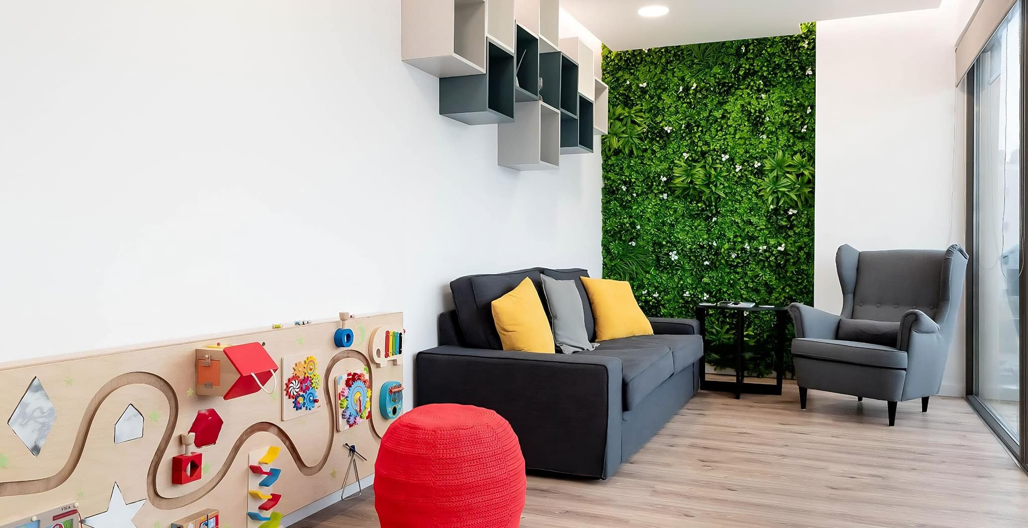 The color palette was carefully selected to evoke calmness and positivity. Soft, muted tones like pastel blues, greens, and yellows were chosen for their soothing qualities, helping to create a peaceful environment. These colors were paired with natural materials such as wood and stone to add warmth and a sense of stability. The layout of the center was reimagined to ensure that each area served its intended purpose effectively, with special attention given to the flow between different spaces. The reception area was designed to be welcoming and non-intimidating, with comfortable seating and playful, yet subtle, decorative elements that would appeal to children and put them at ease.