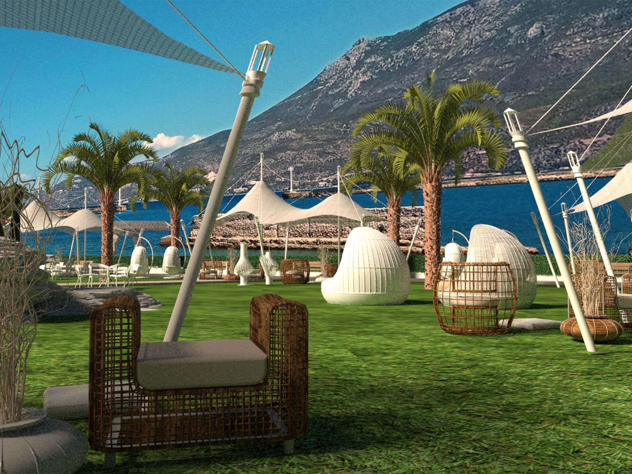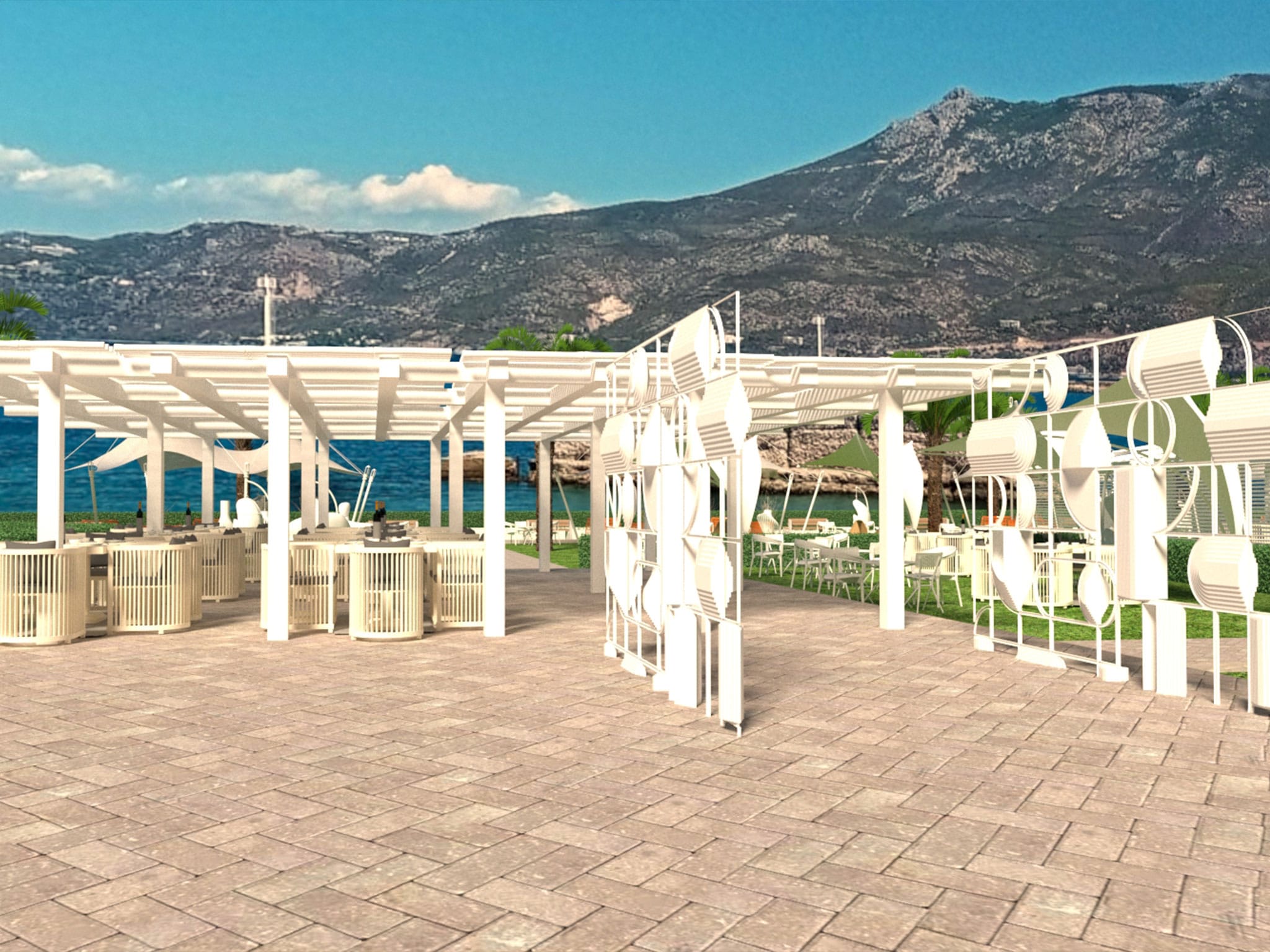 Designing the outdoor reception area required a deep understanding of the local landscape and how to best incorporate it into the guest experience. The primary focus was on utilizing natural materials such as stone, wood, and water elements to create an organic flow between the hotel and its surroundings. The layout was strategically oriented to offer guests unobstructed views of the sunset over the Corinthian Gulf and the historic landmarks of the Isthmus and Diolkos. Rock gardens with integrated ponds and water features were added to enhance the overall aesthetic and introduce a calming, natural ambiance. Special attention was given to the lighting design to highlight the water elements and the natural textures of the materials used, ensuring that the outdoor space would be just as inviting in the evening as it is during the day. The result is a space that serves as both a functional extension of the reception area and a place of reflection and relaxation for hotel guests.